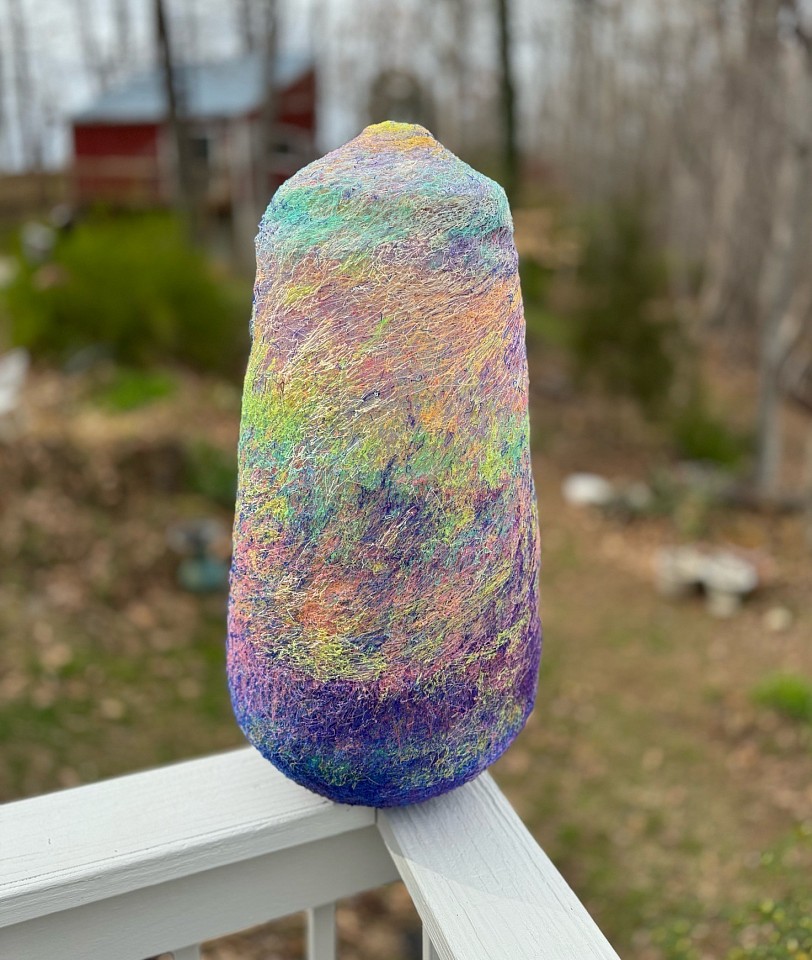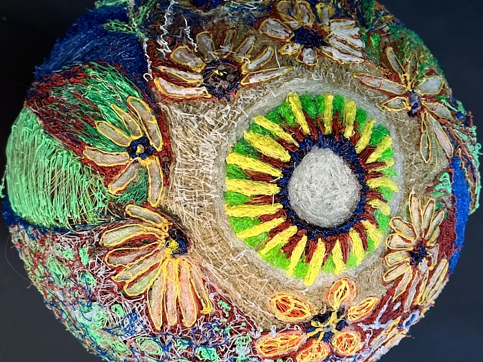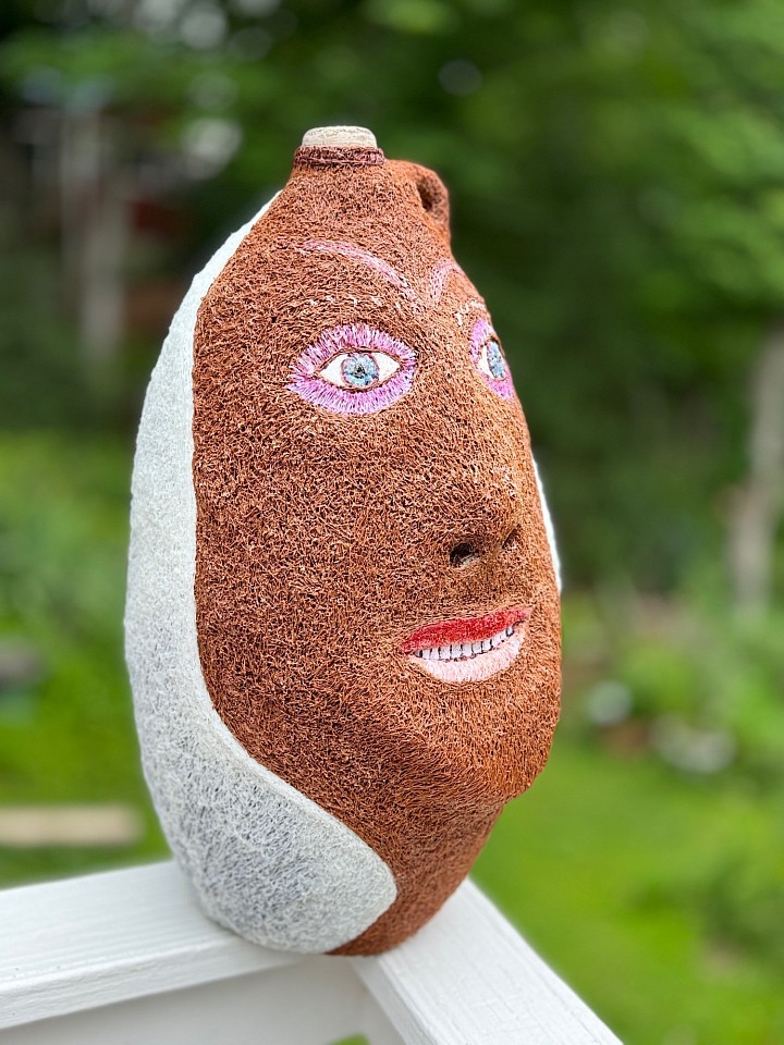 Large and small canvasses offer visuals created using objects that might otherwise find their way to the landfill. Displayed near those works are oversized architectural birdhouses; carved wooden bowls; carved wildlife; carvings of various sizes, and baskets created from laths, pine needles and rope.