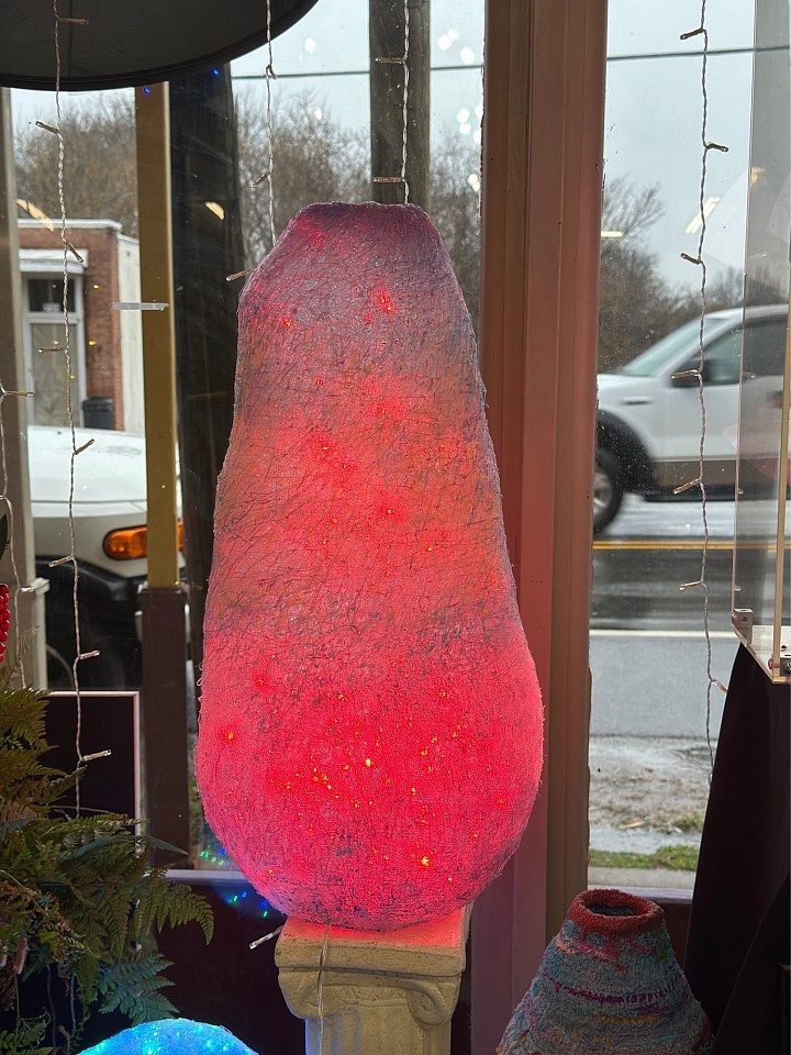 The gallery also offers fiber art works including quilts, rugs and potholders. Pottery from the utilitarian to the precious and from the unusual to the ordinary pique visitors’ interest, according to Cadmus. Jugs, Raku pots, cups, vases, pitchers, plates, platters and facial pottery in various glazes and hues are on display as well.